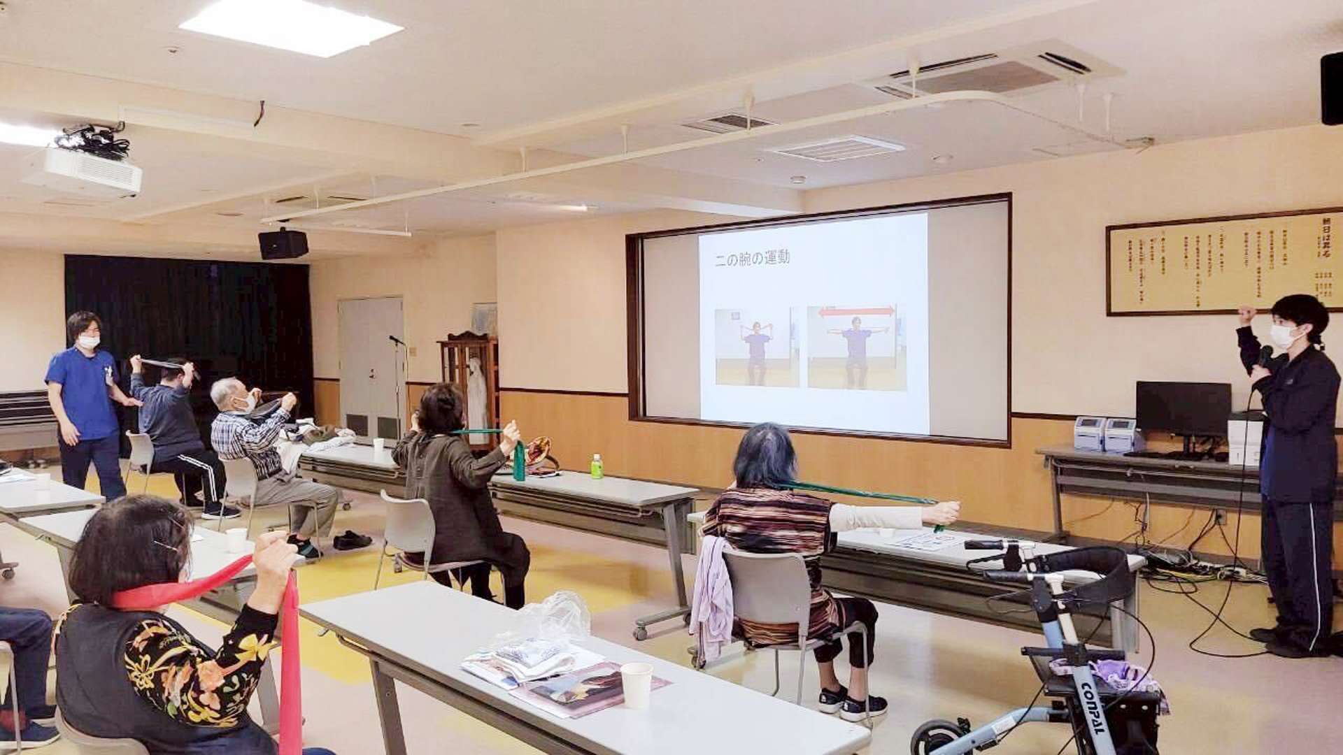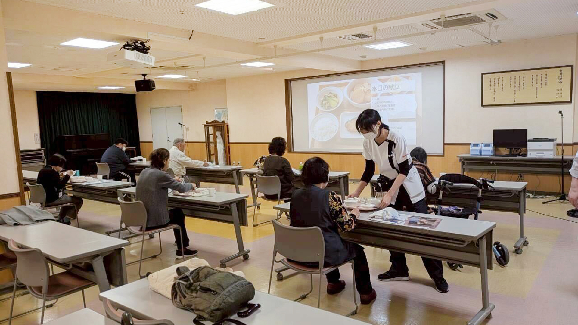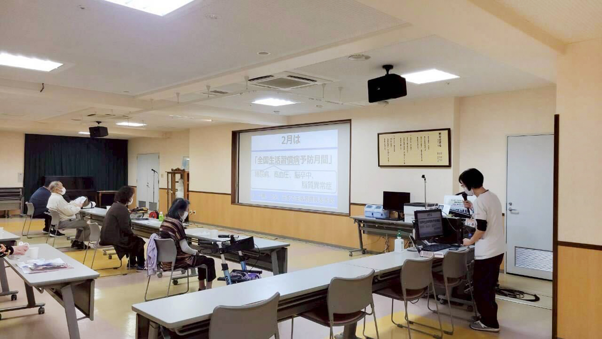 今月の講義は薬剤師より、全国生活習慣病予防月間にちなんで「一無、二少、三多(無煙、少食・少酒、多動・多休・多接)」の大切さについてお話ししました。また、糖尿病と骨折の関係についても解説があり、血糖コントロールが悪いと余分な糖が骨の成分に付着して骨折しやすくなるリスクについて説明がありました。